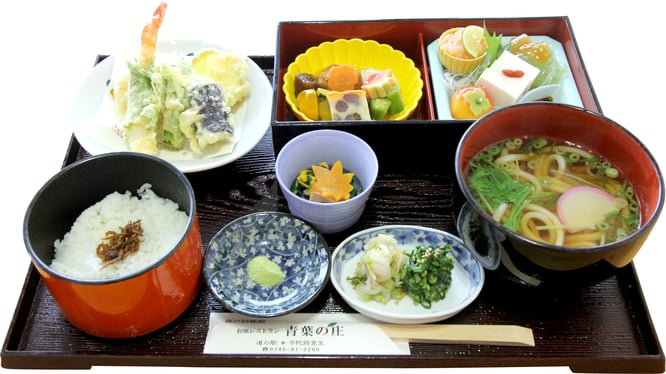 有名料理店・ホテルの料理長など経歴50年の店長が腕を振るう青葉の庄では、丼や麺類をはじめ、旬の安心・安全な地元野菜を使った手作りの精進料理が楽しめます。